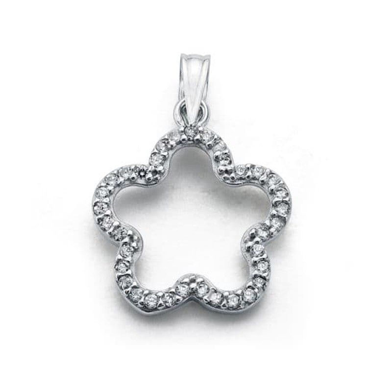Colgante Oro Blanco 9kts 19x16mm 9K16517 Circonitas. Colgante fabricado en oro blanco 9kts. Diseño flor con circonitas. Medidas 19x16mm. Certificado de autenticidad y garantía de calidad en los materiales de fabricación. Ref 9K16517