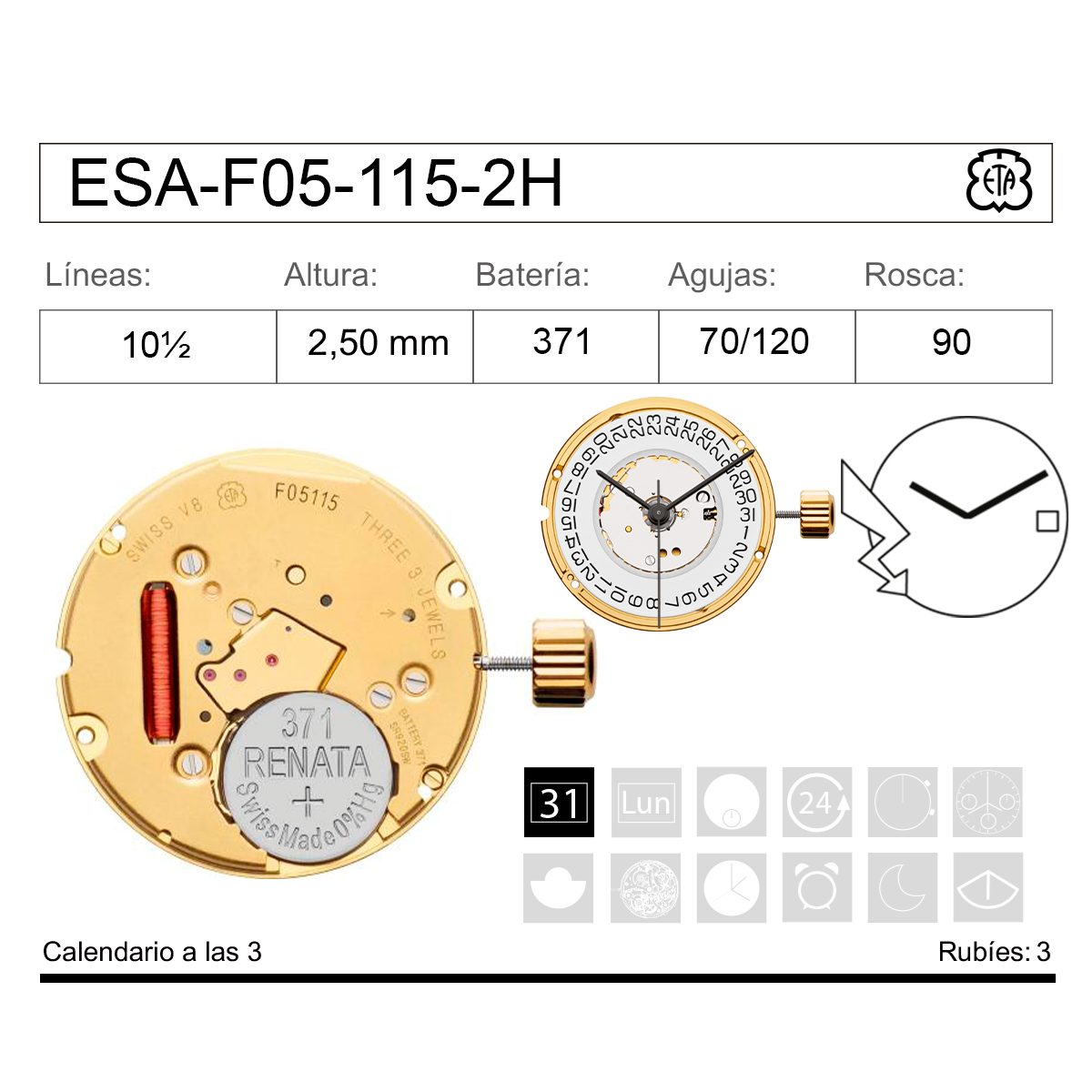 Movimiento Reloj Cuarzo ETA ESA-F05-115-2H Dos Agujas Calendario 3H. Movimiento de cuarzo Bateria 371 con 3 rubíes Pletina Dorada. Diseño de ESA-F05-115-2H con dos agujas, calendario a las 3H. Producto de excelente calidad, con garantía contrastada que asegura su fiabilidad y durabilidad. Ref ESA-F05-115-2H