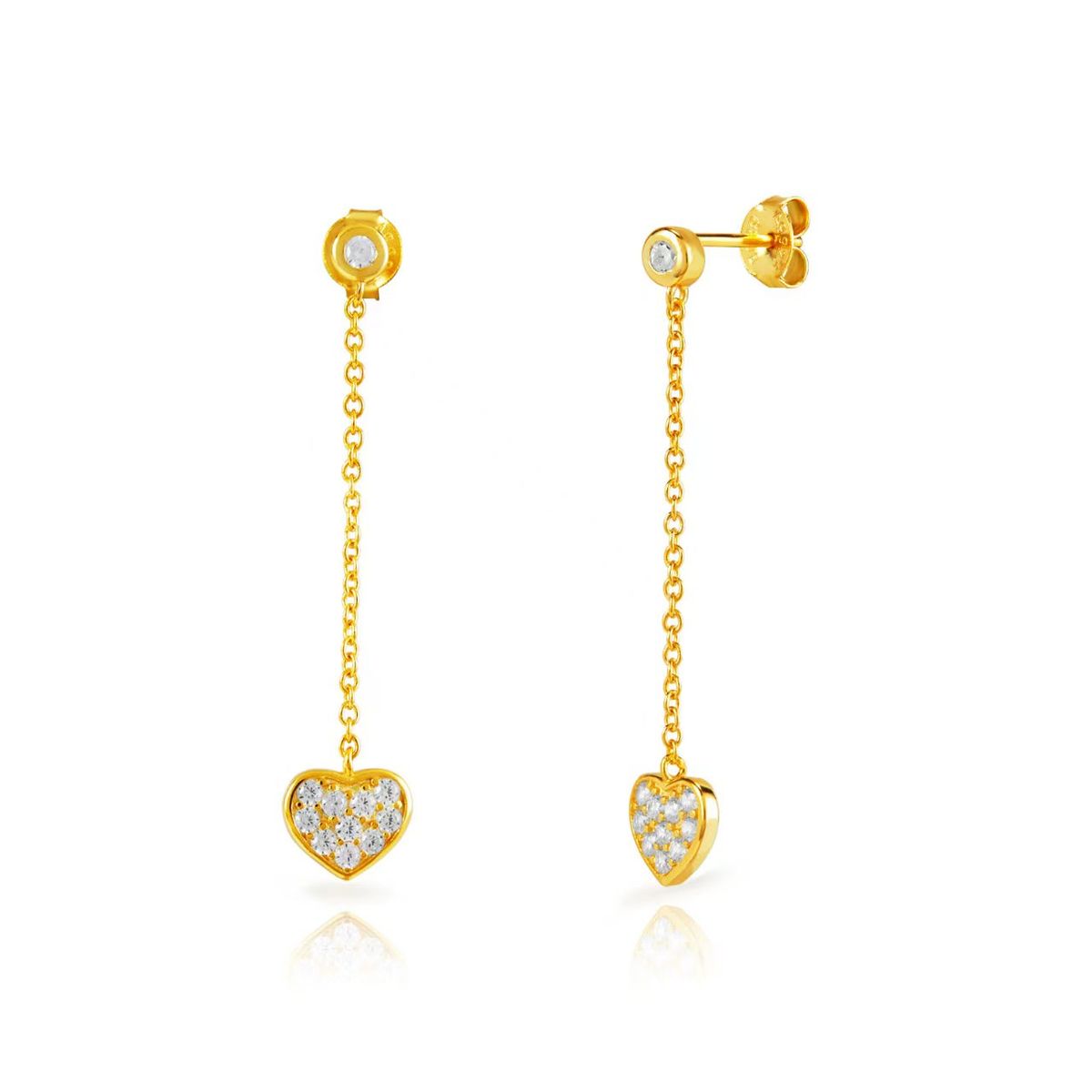 Pendientes Plata Dorada 38mm PEZ1623DO Colgante Corazón Circonitas. Pendientes fabricados en plata de ley 925 bañada en oro de 18 kts. Diseño de colgante de corazón con circonitas. Peso 1,00gr. Medida 38mm. Cierre presión. Certificado de autenticidad y garantía de calidad en los materiales de fabricación. Ref PEZ1623DO