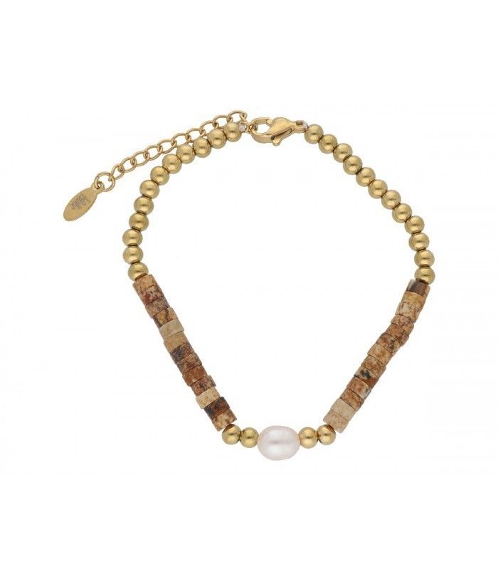 Pulsera Acero Dorado Liska Mujer SHA155-PJ Jaspe Perla. Pulsera fabricada en acero dorado y piedras natutales. Diseño de piedras naturales con jaspe y perla. Colección SIDDHARTHA. Certificado de autenticidad y garantía de calidad en los materiales de fabricación. Ref SHA155-PJ