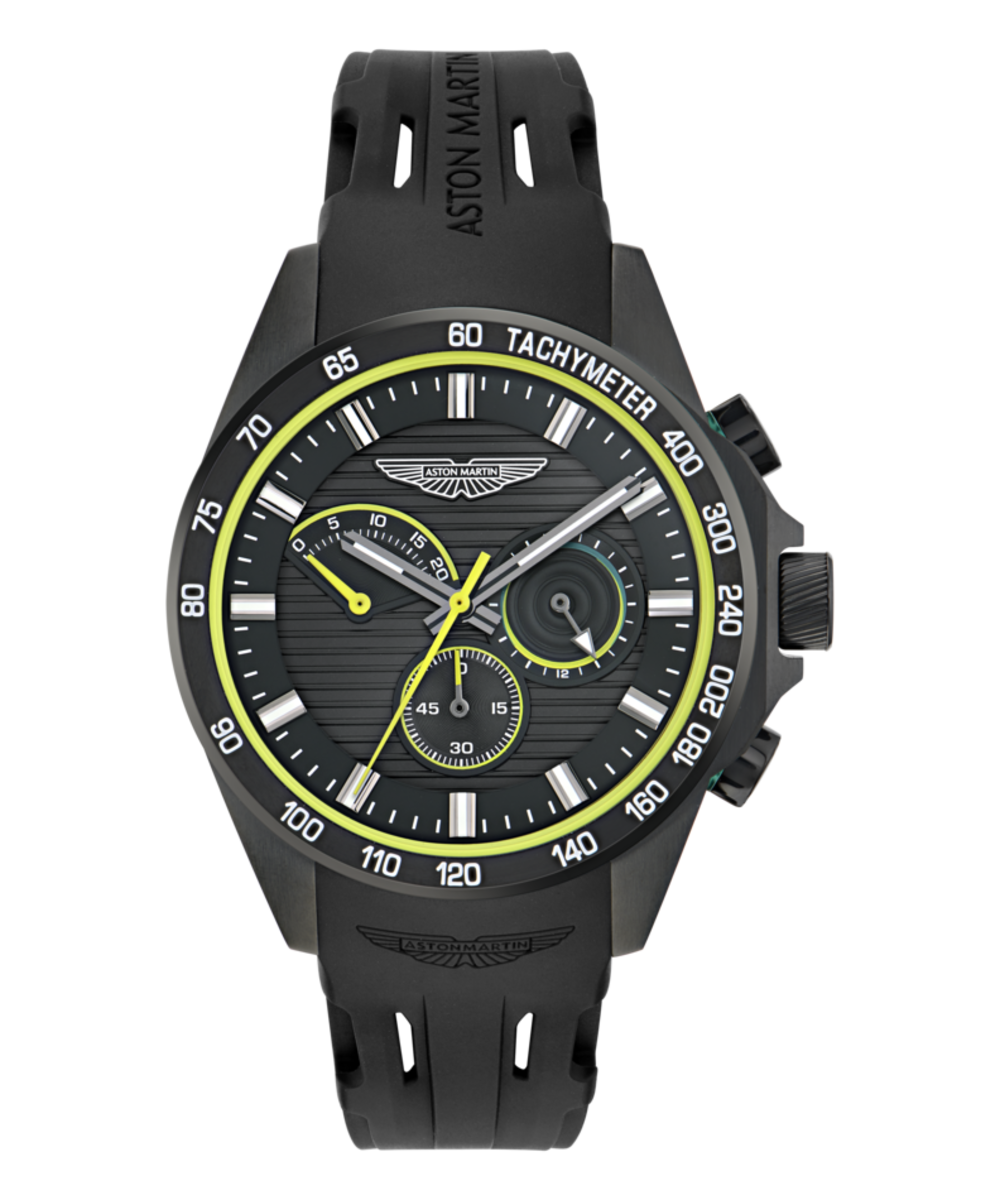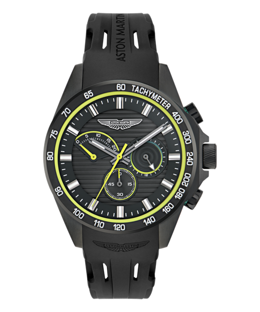 Reloj Aston Martin Hombre MTRH1F503 Cronógrafo Sport Negro Acero Analógico. Caja de acero negro de 44mm de diámetro. Bisel negro bicolor verde. Correa de silicón negro. Cierre hebilla. Esfera negra. Multifunción, cronómetro. Cristal mineral. Movimiento quartz. Sumergible 100m. 3 años de garantía. Ref MTRH1F503