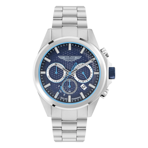 Reloj Aston Martin Hombre MTRH2S602 Cronógrafo Acero Solar. Caja de acero reciclado de 44mm de diámetro. Bisel plateado. Brazalete de acero inoxidable. Cierre desplegable. Esfera azul. Multifunción, cronógrafo, calendario. Cristal mineral. Movimiento quartz solar. Sumergible 100m. 3 años de garantía. Ref MTRH2S602