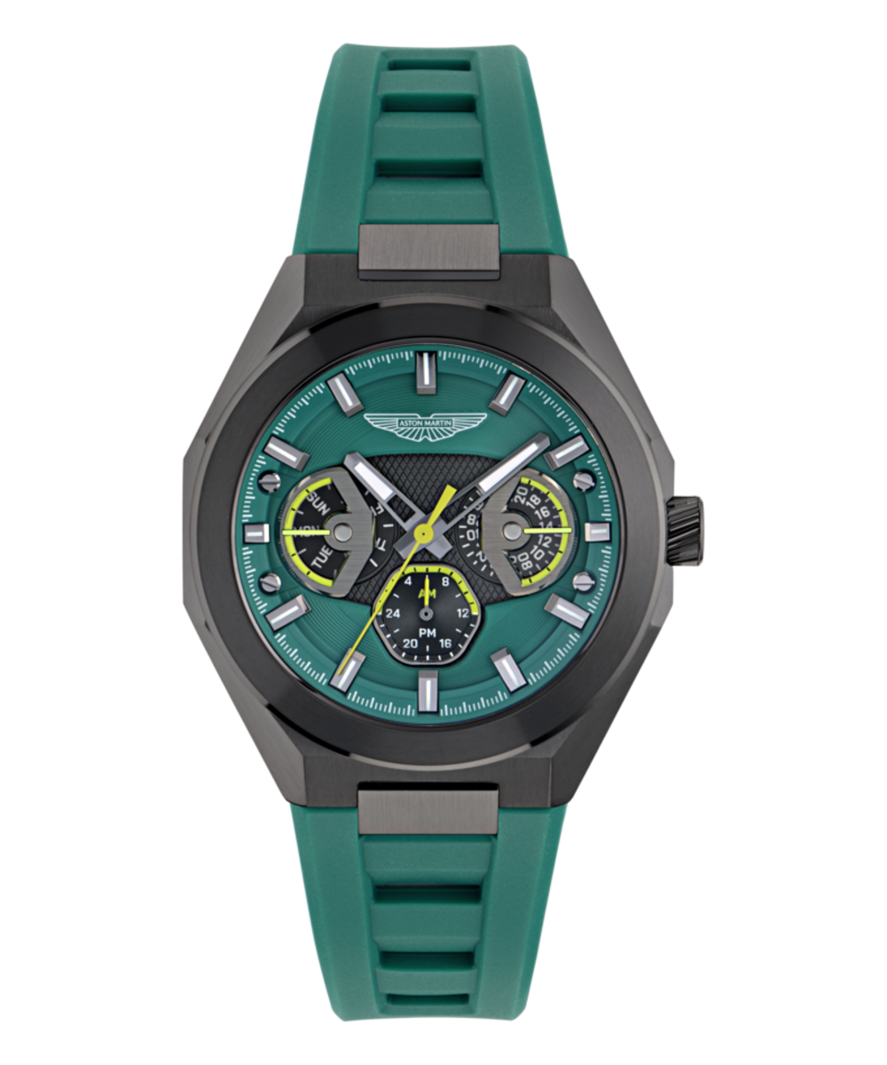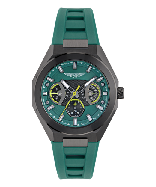 Reloj Aston Martin Hombre MTRI1F503 Sport Verde Acero Analógico. Caja de acero gris de 42mm de diámetro. Bisel gris. Correa de silicón verde. Cierre hebilla. Esfera verde. Multifunción, sub esferas con hora y días. Cristal mineral. Movimiento quartz. Sumergible 100m. 3 años de garantía. Ref MTRI1F503