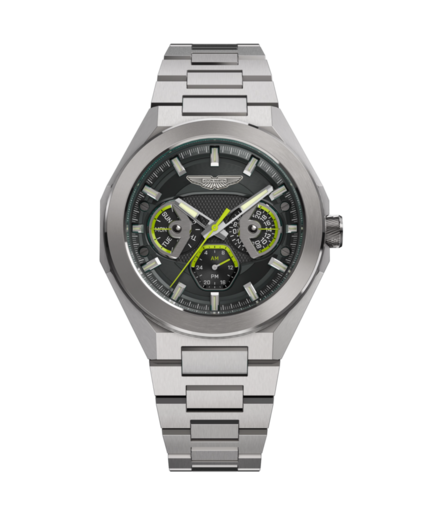 Reloj Aston Martin Hombre MTRI1F505 Acero Analógico. Caja de acero de 42mm de diámetro. Bisel plateado. Brazalete de acero inoxidable. Cierre desplegable. Esfera gris bicolor verde. Multifunción, subesferas con fecha y días. Cristal mineral. Movimiento quartz. Sumergible 100m. 3 años de garantía. Ref MTRI1F505