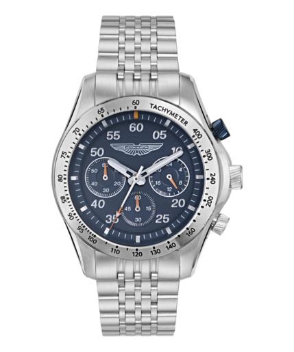 Reloj Aston Martin Hombre MTRS1F503 Cronógrafo Acero Analógico. Caja de acero de 42mm de diámetro. Bisel plateado. Brazalete de acero inoxidable. Cierre desplegable. Esfera azul. Multifunción, cronógrafo. Cristal mineral. Movimiento quartz. Sumergible 100m. 3 años de garantía. Ref MTRS1F503