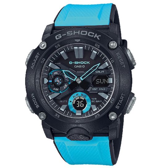 Reloj Casio G-Shock GA-2000-1A2ER Sport Azul. Caja resina negra reforzada con carbono. correa de fibra de carbono azul. Esfera negra. Luz LED. Resistente a los golpes. Cronómetro. Calendario. 5 alarmas diarias. Función de despertador. Cristal mineral. Quartz. Sumergible 200m. Garantía de 2 años. Ref. GA-2000-1A2ER