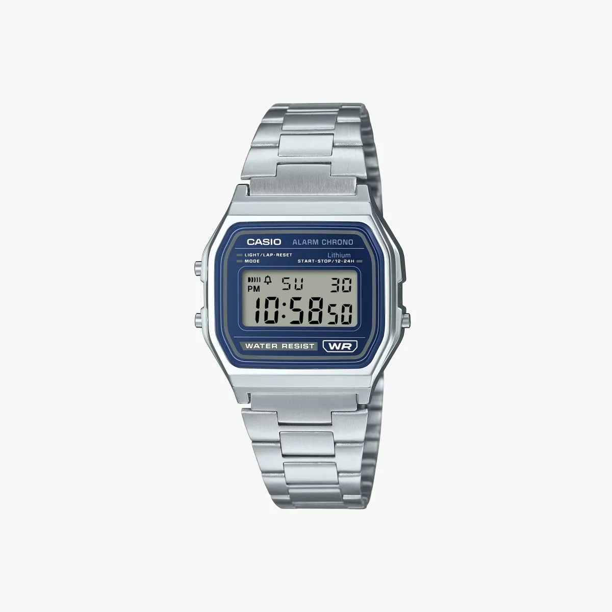Reloj Casio Unisex A158WEA-2 Cronógrafo Digital. Caja de resina de 33,2mm de diámetro. Bisel plateado. Brazalete de acero inoxidable. Cierre ajustable. Esfera azul. Multifunción, calendario, cronógrafo, alarma, cronómetro, y luz led. Cristal resina de vidrio. Movimiento quartz digital. Resistente al agua. Peso 45gr. 3 años de garantía. Ref A158WEA-2