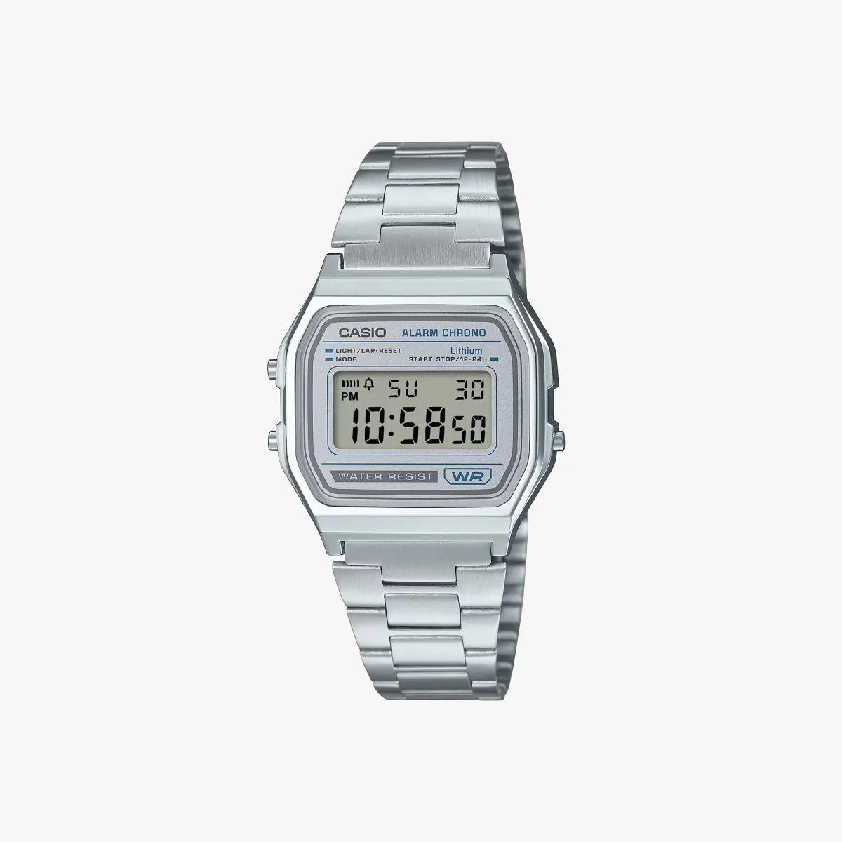 Reloj Casio Unisex A158WEA-7 Cronógrafo Digital. Caja de resina de 33,2mm de diámetro. Bisel plateado. Brazalete de acero inoxidable. Cierre ajustable. Esfera plateada. Multifunción, calendario, cronógrafo, alarma, cronómetro, y luz led. Cristal resina de vidrio. Movimiento quartz digital. Resistente al agua. Peso 45gr. 3 años de garantía. Ref A158WEA-7