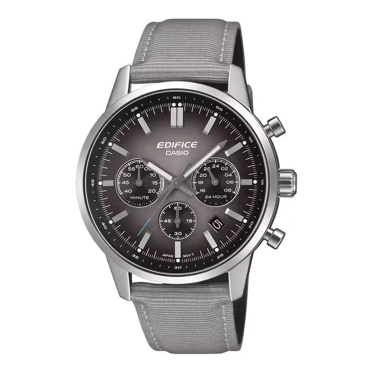Reloj Edifice Hombre EFR-575C-8A Sport Gris Cronógrafo Acero Analógico. Caja de acero de 40,5mm de diámetro. Bisel plateado. Correa de piel/tela gris. Cierre hebilla. Esfera morado oscuro degradado. Multifunción, calendario y cronógrafo. Cristal mineral. Movimiento quartz. Sumergible 100m. Peso 64gr. 3 años de garantía. Ref EFR-575C-8A