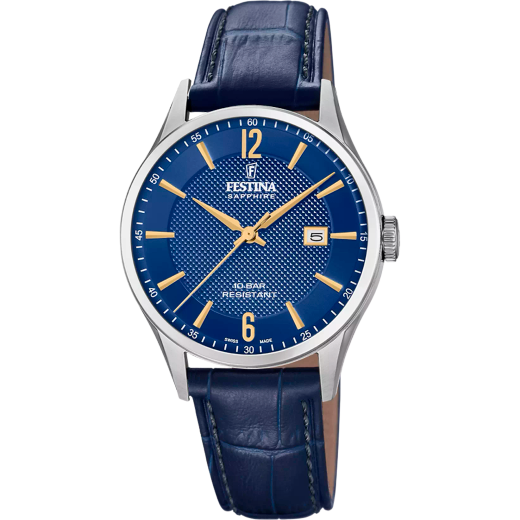 Reloj Festina Hombre F20007/3 Acero Correa Piel Azul Analógico. Caja de acero inoxidable de 40mm de diámetro. Bisel plateado. Correa de piel azul. Cierre de hebilla de acero inoxidable. Esfera azul, agujas doradas. Multifunción calendario, tres agujas. Cristal zafiro. Movimiento quartz. Swiss Made. Sumergible 100m. 3 años de garantía. Peso 60g. Ref F20007/3