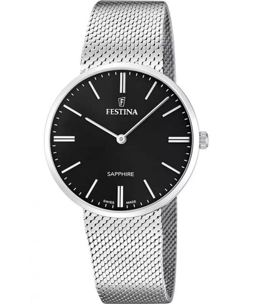 Reloj Festina Hombre F20074/4 Acero Plateado. Caja de acero plateado de 39,3mm de diámetro. Bisel plateado. Correa de malla Milán plateada. Cierre milanés. Esfera negra. Cristal zafiro. Movimiento quartz. Swiss Made. Sumergible 50m. 3 ańos de garantía. Ref F20074/4