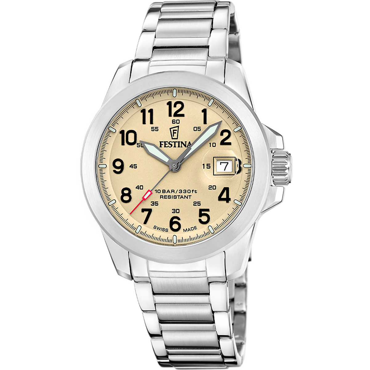 Reloj Festina Hombre F20081/1 Acero Plateado. Caja de acero de 41,8mm de diámetro. Bisel plateado. Brazalete de acero. Cierre desplegable. Esfera marrón claro. Multifunción calendario, tres agujas. Cristal zafiro. Movimiento quartz. Swiss Made. Sumergible 100m. 3 años de garantía. Ref F20081/1