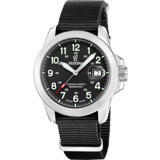 Reloj Festina Hombre F20081/V4 Nylon Negro Acero Plateado. Caja de acero de 41,8mm de diámetro. Bisel plateado. Correa nylon negra. Cierre hebilla. Esfera negra. Multifunción calendario, tres agujas. Cristal zafiro. Movimiento quartz. Swiss Made. Sumergible 100m. 3 ańos de garantía. Ref F20081/V4