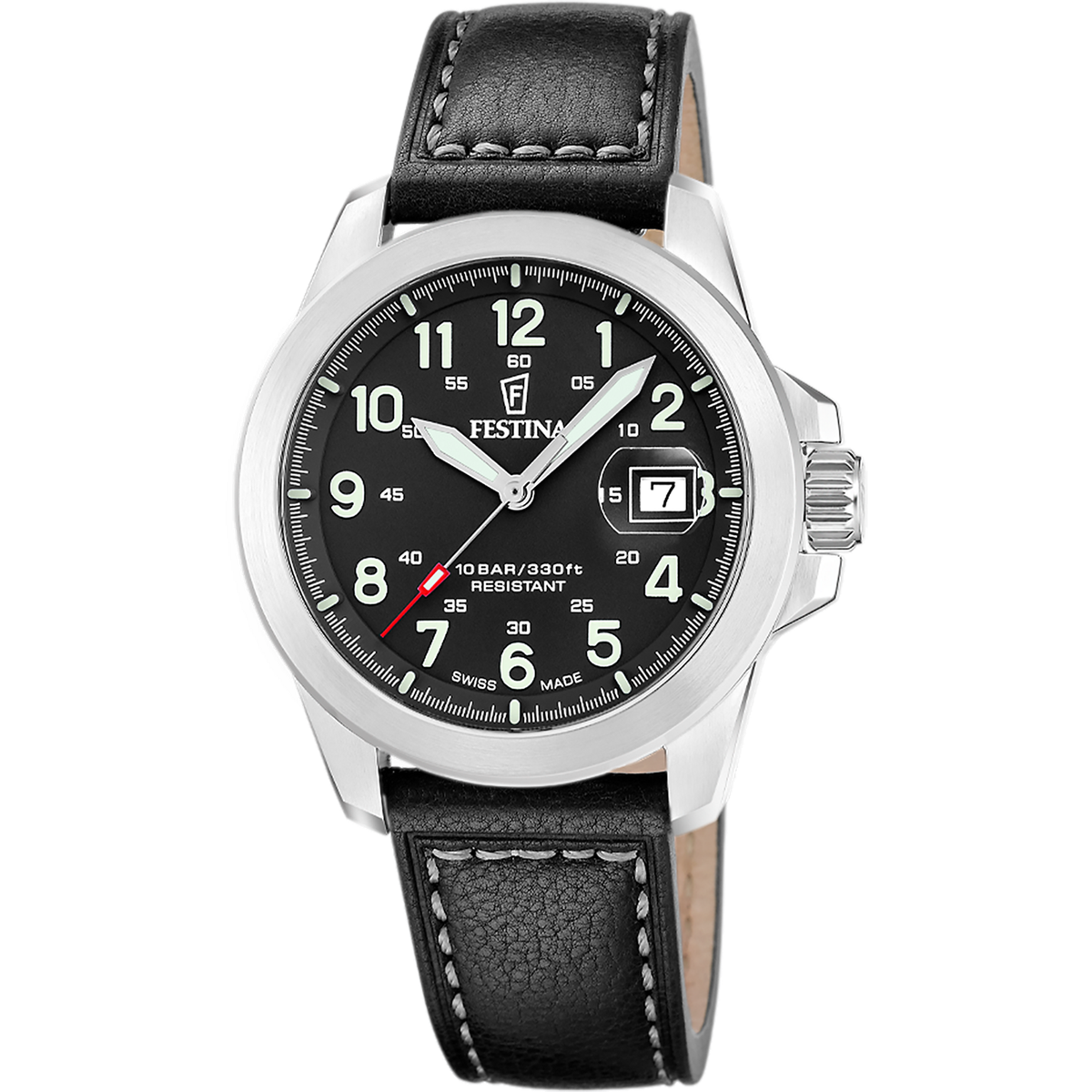 Reloj Festina Hombre F20081/X4 Correa Piel Negra Acero Plateado. Caja de acero de 41,8mm de diámetro. Bisel plateado. Correa de piel negra. Cierre desplegable. Esfera negra. Multifunción calendario, tres agujas. Cristal zafiro. Movimiento quartz. Swiss Made. Sumergible 100m. 3 ańos de garantía. Ref F20081/X4