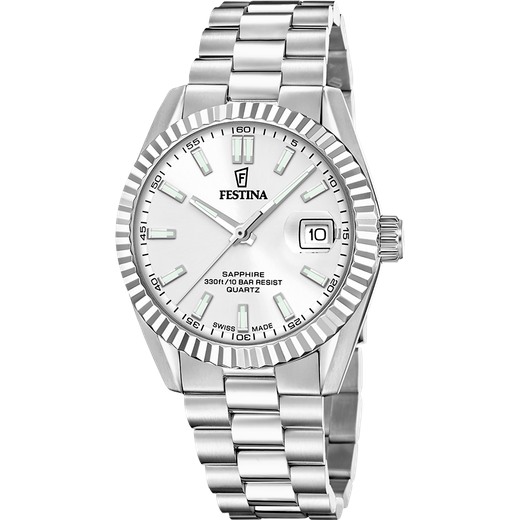 Reloj Festina Hombre F20084/A Swiss Made Acero Analógico. Caja de acero de 40mm de diámetro. Bisel plateado. Brazalete de acero inoxidable. Cierre desplegable. Esfera plateada. Multifunción, calendario. Cristal zafiro. Movimiento quartz. Sumergible 100m. Swiss Made. 3 años de garantía. Ref F20084/A