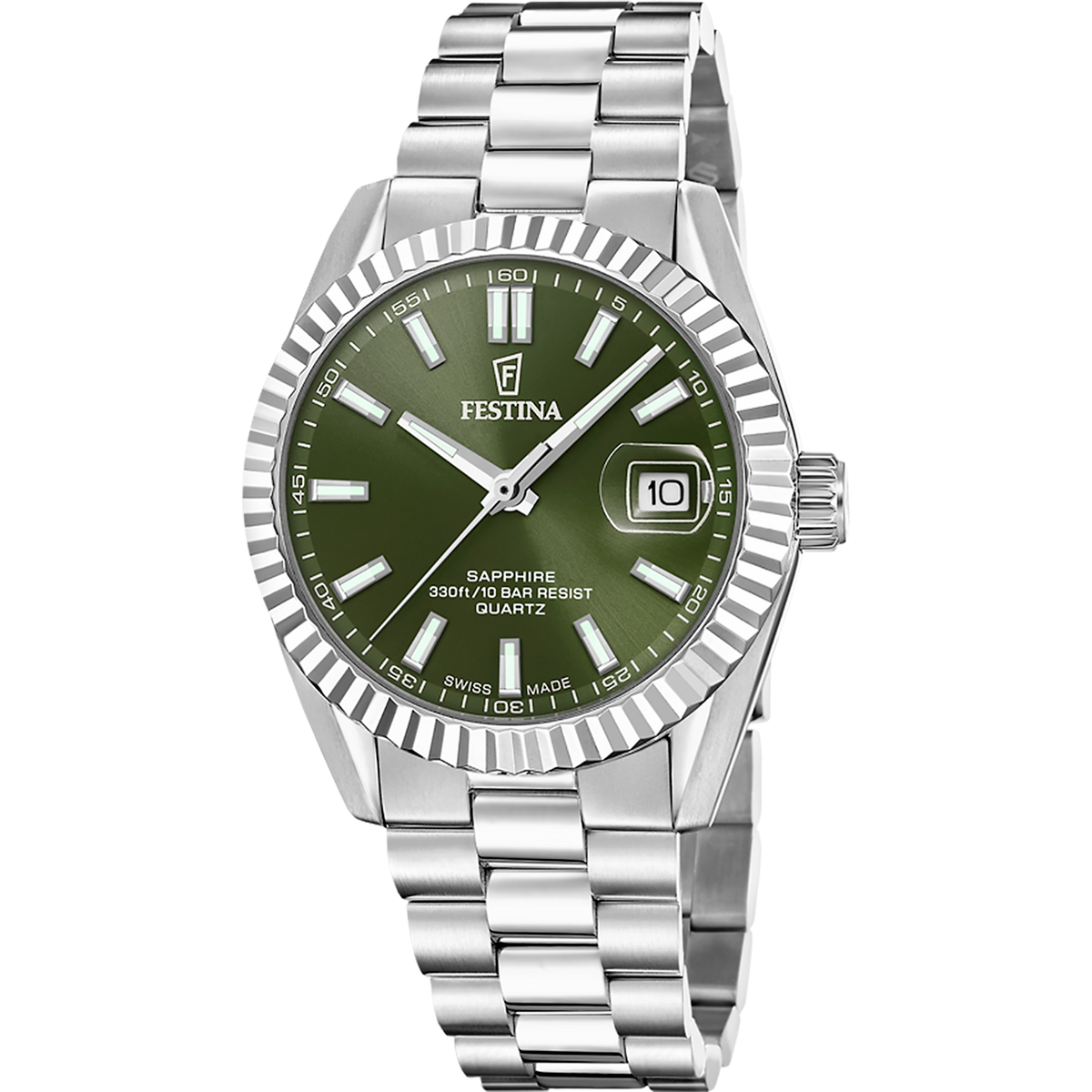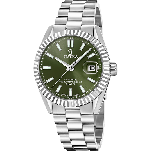 Reloj Festina Hombre F20084/C Swiss Made Acero Analógico. Caja de acero de 40mm de diámetro. Bisel plateado. Brazalete de acero inoxidable. Cierre desplegable. Esfera verde. Multifunción, calendario. Cristal zafiro. Movimiento quartz. Sumergible 100m. Swiss Made. 3 años de garantía. Ref F20084/C