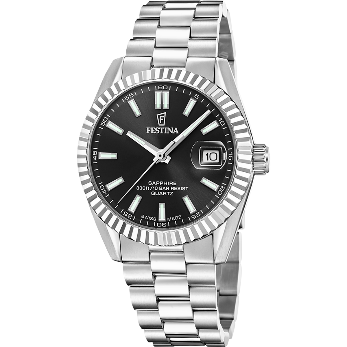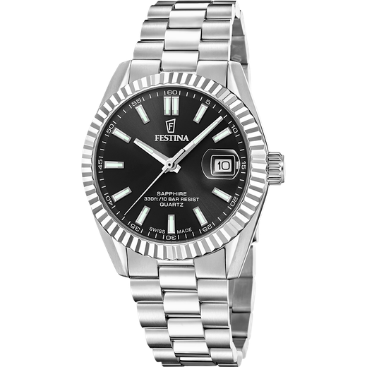 Reloj Festina Hombre F20084/D Swiss Made Acero Analógico. Caja de acero de 40mm de diámetro. Bisel plateado. Brazalete de acero inoxidable. Cierre desplegable. Esfera negra. Multifunción, calendario. Cristal zafiro. Movimiento quartz. Sumergible 100m. Swiss Made. 3 años de garantía. Ref F20084/D