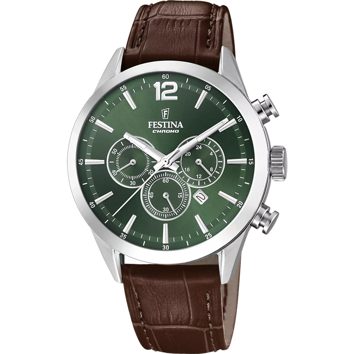 Reloj Festina Hombre F20542/8 Acero Correa Piel Marrón Cronógrafo Analógico. Caja de acero inoxidable de 43,5mm de diámetro. Bisel plateado. Correa de piel marrón. Cierre hebilla. Esfera verde. 6 Agujas. Multifunción, cronógrafo, calendario. Cristal mineral. Movimiento quartz. Sumergible 50m. 3 años de garantía. Peso 72g. Ref F20542/8