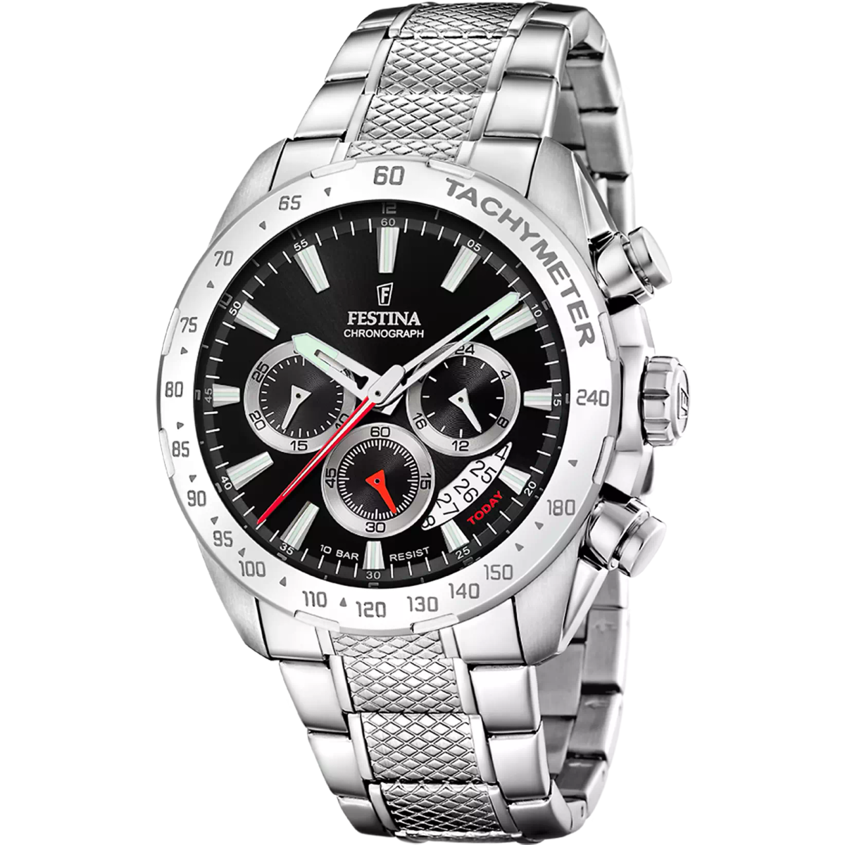 Reloj Festina Hombre F20668/4 Acero Cronógrafo Analógico. Caja de acero inoxidable de 44,5mm de diámetro. Bisel plateado. Brazalete de acero. Cierre desplegable. Esfera negra. 6 Agujas. Multifunción, cronógrafo, calendario. Cristal mineral. Movimiento quartz. Sumergible 100m. 3 años de garantía. Peso 117,9g. Ref F20668/4