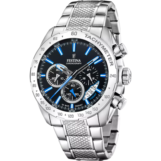 Reloj Festina Hombre F20668/6 Acero Cronógrafo Analógico. Caja de acero inoxidable de 44,5mm de diámetro. Bisel plateado. Brazalete de acero. Cierre desplegable. Esfera negra con detalles azul. 6 Agujas. Multifunción, cronógrafo, calendario. Cristal mineral. Movimiento quartz. Sumergible 100m. 3 años de garantía. Peso 117,73g. Ref F20668/6