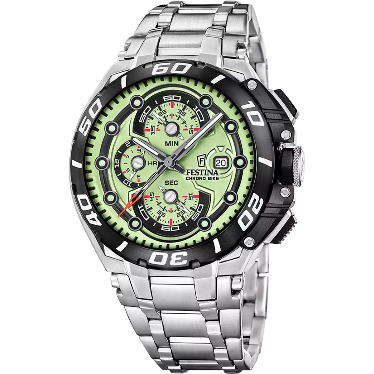 Reloj Festina Hombre F20754/3 Chrono Bike Cronógrafo Acero Analógico. Caja de acero de 46mm de diámetro. Bisel negro. Brazalete de acero inoxidable. Cierre desplegable. Esfera verde. Multifunción, calendario y cronógrafo. Cristal mineral. Movimiento quartz. Sumergible 200m. 3 años de garantía. Ref F20754/3