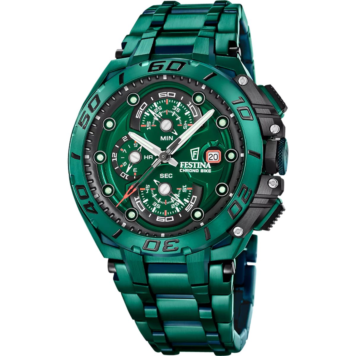 Reloj Festina Hombre F20758/1 Acero Verde Analógico. Caja de acero verde de 46mm de diámetro. Bisel verde. Brazalete de acero verde. Incluye correa de silicón negro intercambiable mas herramienta para hacerlo. Cierre desplegable. Esfera verde. Multifunción, calendario y subesferas con fecha y días. Cristal zafiro. Movimiento quartz. Sumergible 200m.. 3 años de garantía. Ref F20758/1