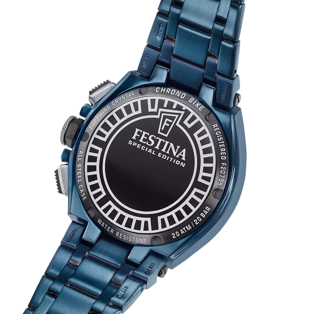 Reloj Festina Hombre F20759/1 Acero Azul Bicolor Negro Analógico. Caja de acero negro de 46mm de diámetro. Bisel negro. Brazalete de acero azul. Incluye correa de silicón azul intercambiable mas herramienta para hacerlo. Cierre desplegable. Esfera negra multicolor. Multifunción, calendario y subesferas con fecha y días. Cristal zafiro. Movimiento quartz. Sumergible 200m.. 3 años de garantía. Ref F20759/1