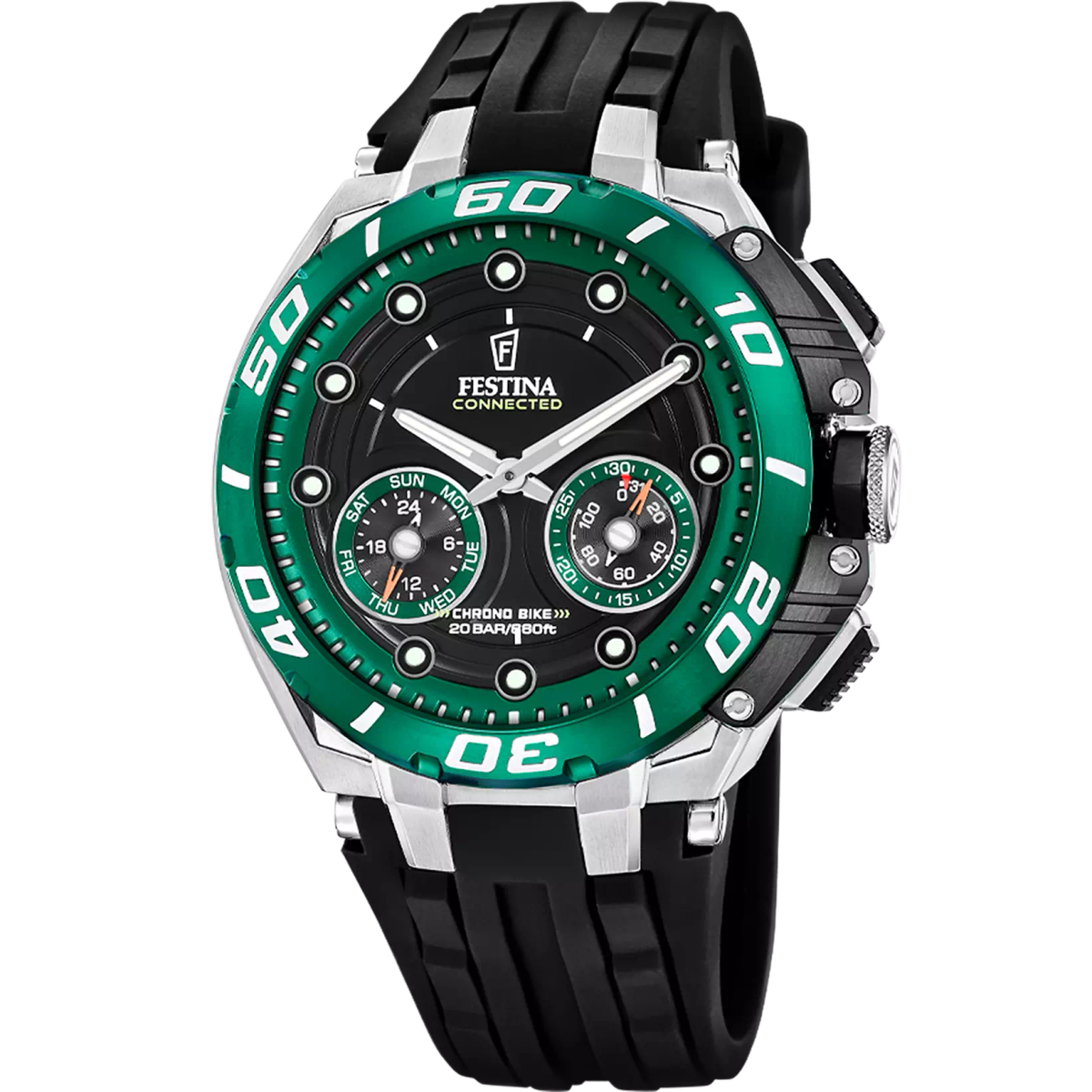 Reloj Festina Hombre F20763/2 Connected Sport Verde. Caja de acero de 46mm de diámetro. Bisel verde. Correa silicona negra. Esfera negra. Multifunción, calendario y subesferas con fecha y días. Cristal zafiro. Movimiento quartz. Sumergible 200m.. 3 años de garantía Ref F20763/2.