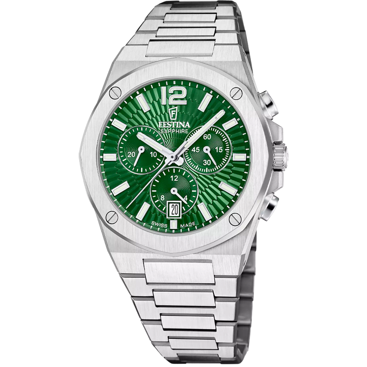 Reloj Festina Hombre F22002/3 Swiss Made Cronógrafo Acero Analógico. Caja de acero de 42mm de diámetro. Bisel plateado. Brazalete de acero inoxidable. Cierre desplegable. Esfera verde. Multifunción, cronógrafo y calendario. Cristal zafiro. Movimiento quartz. Sumergible 100m. Swiss Made. 3 años de garantía. Ref F22002/3