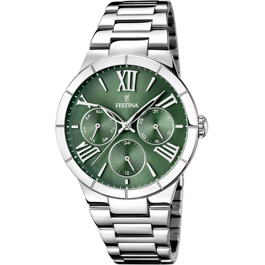 Reloj Festina Mujer F16716/5 Acero Analógico. Caja de acero inoxidable de 36,5mm de diámetro. Bisel plateado. Brazalete de acero. Cierre doble pulsador. Esfera verde. Multifunción calendario, 6 agujas. Cristal mineral. Movimiento quartz. Sumergible 50m. 3 años de garantía. Peso 87g. Ref F16716/5