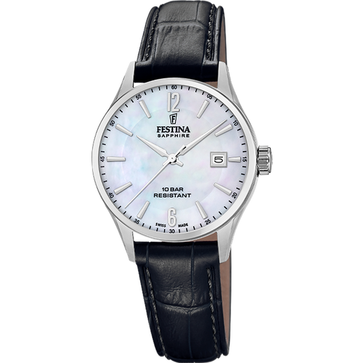 Reloj Festina Mujer F20009/7 Acero Correa Piel Negra Analógico. Caja de acero inoxidable de 29mm de diámetro. Bisel plateado. Correa de piel negra. Cierre de hebilla de acero inoxidable. Esfera blanca. Multifunción calendario, tres agujas. Cristal zafiro. Movimiento quartz. Swiss Made. Sumergible 100m. 3 años de garantía. Peso 32g. Ref F20009/7
