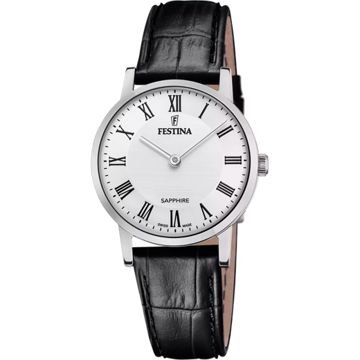 Reloj Festina Mujer F20013/2 Acero Correa Piel Negra Analógico. Caja de acero inoxidable de 29,3mm de diámetro. Bisel plateado. Correa de piel negra. Cierre de hebilla de acero inoxidable. Esfera blanca. Cristal zafiro. Movimiento quartz. Swiss Made. Sumergible 50m. 3 años de garantía. Peso 36,49g. Ref F20013/2