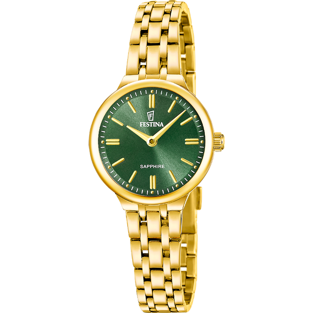 Reloj Festina Mujer F20745/3 Acero Dorado Analógico. Caja de acero dorado de 26mm de diámetro. Bisel dorado. Brazalete de acero inoxidable dorado. Cierre desplegable. Esfera verde. Cristal zafiro. Movimiento quartz. Sumergible 50m. Peso 46,32gr. 3 años de garantía. Ref F20745/3