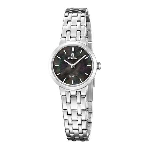 Reloj Festina Mujer F20746/6 Acero Analógico. Caja de acero de 23mm de diámetro. Bisel plateado. Brazalete de acero inoxidable. Cierre desplegable. Esfera negra. Cristal mineral. Movimiento quartz. Sumergible 50m. Peso 50,14gr. 3 años de garantía. Ref F20746/6