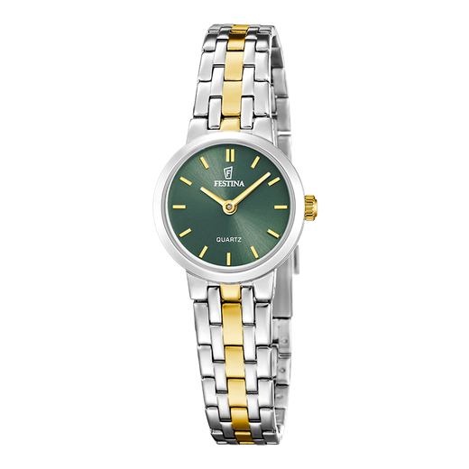 Reloj Festina Mujer F20747/3 Acero Bicolor Dorado Analógico. Caja de acero bicolor dorado de 23mm de diámetro. Bisel plateado. Brazalete de acero inoxidable bicolor dorado. Cierre desplegable. Esfera verde. Cristal mineral. Movimiento quartz. Sumergible 50m. Peso 50,14gr. 3 años de garantía. Ref F20747/3