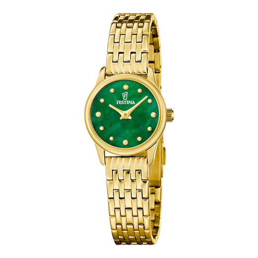 Reloj Festina Mujer F20750/5 Acero Dorado Analógico. Caja de acero dorado de 23mm de diámetro. Bisel dorado. Brazalete de acero inoxidable dorado. Cierre desplegable. Esfera verde. Cristal mineral. Movimiento quartz. Sumergible 50m. Peso 48,15gr. 3 años de garantía. Ref F20750/5