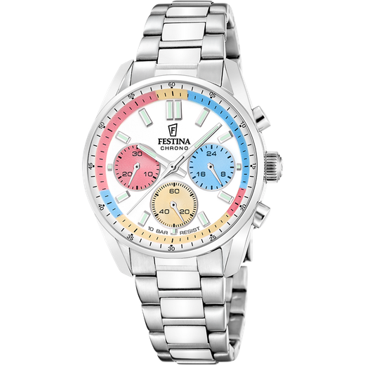 Reloj Festina Unisex F20753/6 Cronógrafo Acero Analógico. Caja de acero de 37,5mm de diámetro. Bisel plateado. Brazalete de acero inoxidable. Cierre desplegable. Esfera multicolor. Multifunción, cronógrafo. Cristal mineral. Movimiento quartz. Sumergible 100m. Peso 106,7gr. 3 años de garantía. Ref F20753/6