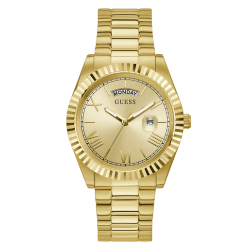 Reloj Guess Hombre GW0265G2 Acero Dorado Analógico. Caja de acero dorado de 42mm de diámetro. Bisel dorado. Brazalete de acero inoxidable dorado. Cierre desplegable. Esfera dorada. Multifunción, calendario. Cristal mineral. Movimiento quartz. Sumergible 50m. 3 años de garantía. Ref GW0265G2