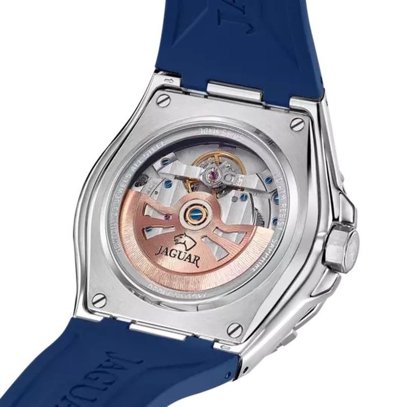 Reloj Jaguar Hombre J1030/2 Sport Azul.Caja de acero inoxidable 316I de 44mm de diametro, 12,45mm de grosor. Bisel de acero inoxidable 316I. Correa de silicona azul de 28mm de ancho. Cierre de hebilla. Esfera azul. Multifunción, calendario. Swiss made. Cristal zafiro. Movimiento automático Pc092 Newton. Sumergible 100m. 3 años de garantía. Ref J1030/2