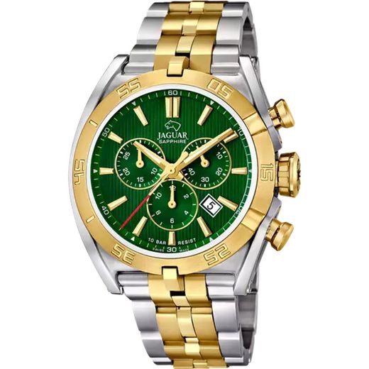 Reloj Jaguar Hombre J855/B Acero Bicolor Dorado Executive.Caja de acero inoxidable 316I bicolor dorado de 46mm de diametro, 14,4mm bicolor dorado de grosor. Bisel de acero inoxidable 316I dorado. Brazalete de acero inoxidable 316I bicolor dorado 26,5mm de ancho. Cierre desplegable. Esfera verde. Multifunción, calendario, cronógrafo. Swiss made. Cristal zafiro. Movimiento quartz. Sumergible 100m. 3 años de garantía. Ref J855/B