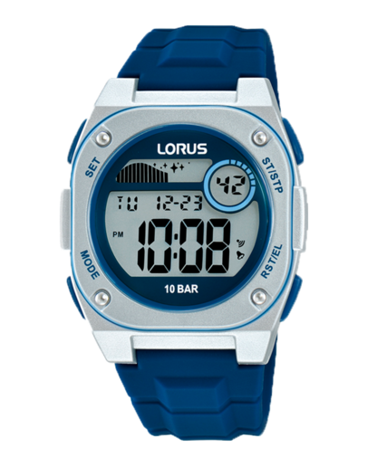 Reloj Lorus Hombre R2333QX9 Sport Azul Digital. Caja de plástico plateado de 38mm de diámetro. Bisel plateado. Correa de silicón azul. Cierre hebilla. Esfera azul. Multifunción, funciones digitales y calendario. Cristal acrílico. Movimiento quartz. Sumergible 100m. 3 años de garantía. Ref R2333QX9