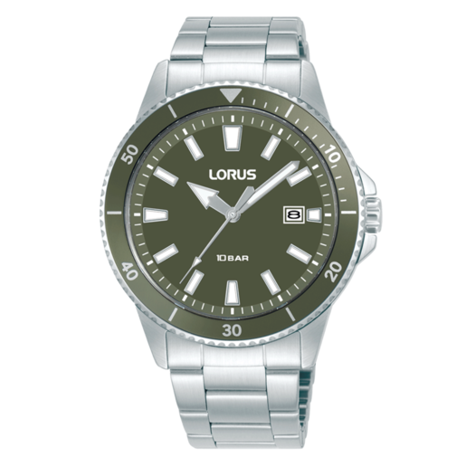 Reloj Lorus Hombre RH903SX9 Acero Analógico. Caja de acero de 42mm de diámetro. Bisel verde oliva. Brazalete de acero inoxidable. Cierre desplegable. Esfera verde oliva. Multifunción, calendario. Cristal mineral. Movimiento quartz. Sumergible 100m. 3 años de garantía. Ref RH903SX9