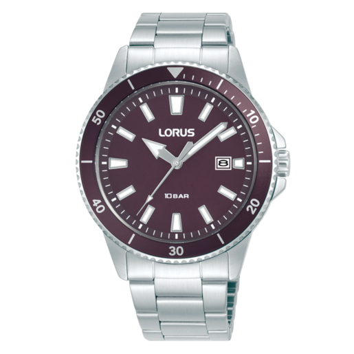 Reloj Lorus Hombre RH905SX9 Acero Analógico. Caja de acero de 40mm de diámetro. Bisel burdeos. Brazalete de acero inoxidable. Cierre desplegable. Esfera burdeos. Multifunción, calendario. Cristal mineral. Movimiento quartz. Sumergible 100m. 3 años de garantía. Ref RH905SX9