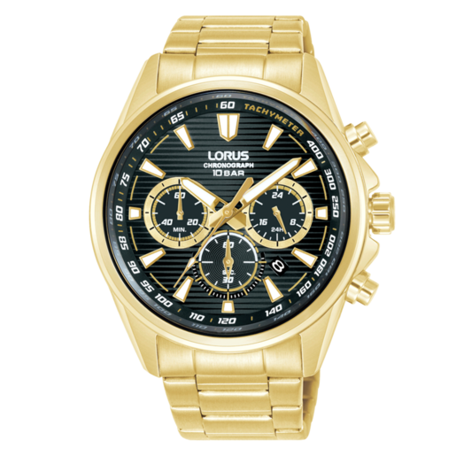 Reloj Lorus Hombre RT324LX9 Cronógrafo Acero Dorado Analógico. Caja de acero dorado de 43mm de diámetro. Bisel dorado. Brazalete de acero inoxidable dorado. Cierre desplegable. Esfera negra. Multifunción, cronógrafo y calendario. Cristal mineral. Movimiento quartz. Sumergible 100m. 3 años de garantía. Ref RT324LX9