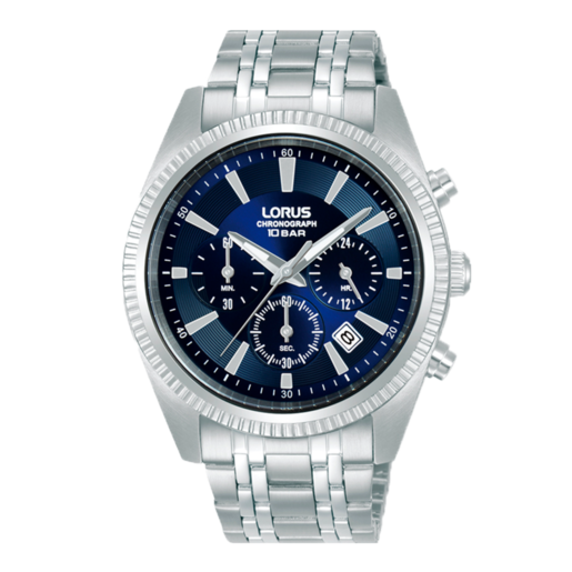 Reloj Lorus Hombre RT395KX9 Cronógrafo Acero Analógico. Caja de acero de 42mm de diámetro. Bisel plateado. Brazalete de acero inoxidable. Cierre desplegable. Esfera azul. Multifunción, cronógrafo y calendario. Cristal mineral. Movimiento quartz. Sumergible 100m. 3 años de garantía. Ref RT395KX9