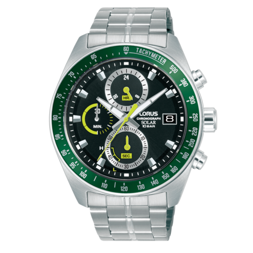 Reloj Lorus Hombre RZ619AX9 Cronógrafo Acero Solar. Caja de acero de 43mm de diámetro. Bisel verde. Brazalete de acero inoxidable. Cierre desplegable. Esfera negra. Multifunción, cronógrafo y calendario. Cristal mineral. Movimiento solar VR43. Sumergible 100m. 3 años de garantía. Ref RZ619AX9
