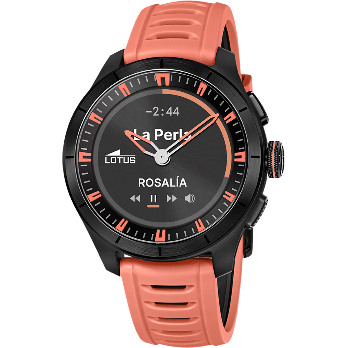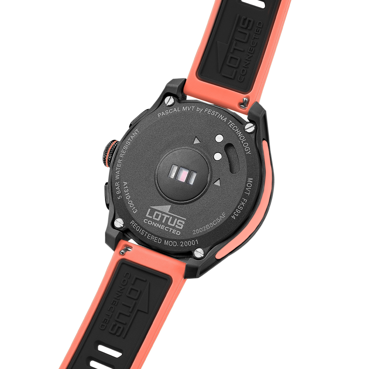 Reloj Lotus Hombre 20001/6 Connected Sport Naranja. Caja de plástico negro de 45mm de diámetro. Bisel negro. Correa de silicón naranja. Cierre hebilla. Multifunción, Frecuencia cardíaca, GPS, Historial entrenamiento, monitorización de sueño, condición física (VO2max), estrés, hora mundial, temporizador, cronómetro, alarma, clima, encontrar teléfono, control música, notificaciones. Cristal mineral. Movimiento quartz. Sumergible 50m. 3 años de garantía. Ref 20001/6