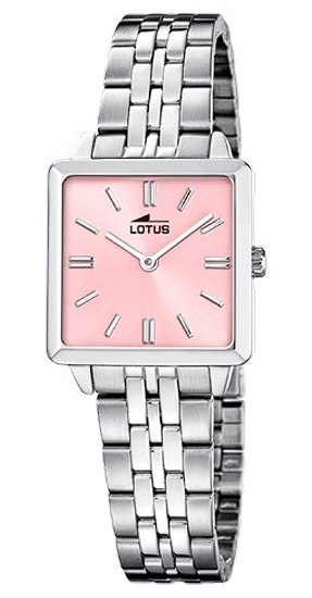 Reloj Lotus Mujer 19010/2 Acero Plateado. Caja de acero plateado de 26mm de ancho. Bisel plateado. Brazalete de acero plateado. Cierre desplegable. Esfera rosa. Cristal mineral. Movimiento quartz. Peso 62,45g. 3 ańos de garantía. Ref 19010/2