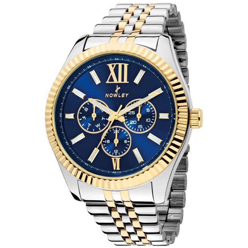 Reloj Nowley Hombre 8-0084-0-0 Acero Bicolor Dorado. Caja de acero Bicolor Dorado de 44mm. Brazalete de acero bicolor dorado. Cierre desplegable. Esfera azul. Multifunción, calendario. Cristal mineral. Movimiento quartz. Sumergible 50m. 3 años de garantía. Ref 8-0084-0-0