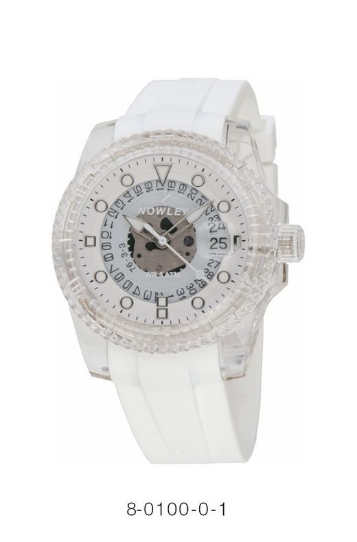 Reloj Nowley Hombre 8-0100-0-1 Sport Blanco. Caja de plástico transparente blanca de 40mm, bisel de plástico transparente. Correa de caucho blanco. Cierre hebilla. Esfera blanca. Multifunción, calendario. Cristal mineral. Movimiento quartz. Sumergible 50m. 3 años de garantía. Ref 8-0100-0-1